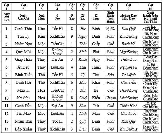 Cột 10: Xuất hành theo hướng gặp Hỷ Thần, tạo niềm vui. Ví dụ ngày mồng 1 âm lịch đi theo hướng Tây Bắc. Dòng 2 Xuất hành theo hướng gặp Tài Thần, được tài lộc.