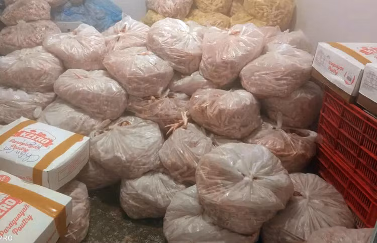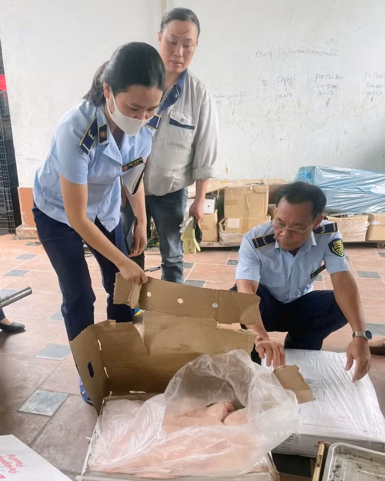 Tại thời điểm kiểm tra lực lượng chức năng đã phát hiện tại hộ kinh doanh Lục Hồng đang tàng trữ 500kg chân gà nguyên xương đông lạnh được đựng trong túi ni lông màu trắng không có nhãn mác, không có hóa đơn, chứng từ; 5 thùng thịt trâu (20kg/thùng) đông lạnh có nhãn in chữ nước ngoài, do nước ngoài sản xuất, không có nhãn phụ bằng tiếng Việt Nam; 5 thùng má lợn (20kg/thùng) đông lạnh có nhãn in chữ nước ngoài, do nước ngoài sản xuất, không có nhãn phụ bằng tiếng Việt Nam.