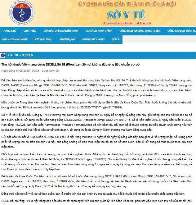 Thông báo của Sở Y tế Hà Nội thu hồi thuốc Viên nang cứng Dicellnase (Piroxicam 20mg)/Ảnh chụp màn hình