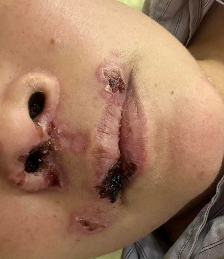 Bệnh nhân nhập viện Bệnh viện Đa khoa tỉnh Nam Định đã được đặt ống Nội khí quản và được chẩn đoán: Viêm màng não và chuyển Bệnh viện bệnh Bệnh Nhiệt đới Trung ương trong tình trạng hôn mê sâu, ban xuất huyết dạng đám, dải vùng cẳng bàn tay, bàn chân 2 bên, phổi có tình trạng viêm.
