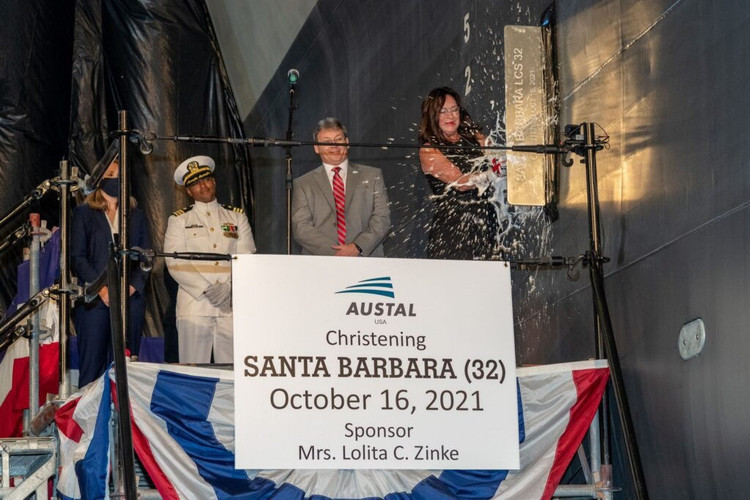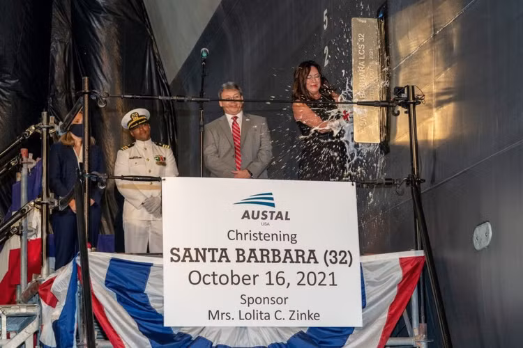 Mẹ đỡ đầu của chiến hạm - Lolita Zinke - thực hiện nghi lễ đập chai champagne trên mũi tàu Santa Barbara, chiếc LCS thứ 16 do Austal USA thiết kế và thi công và là chiếc thứ 3 của Hải quân Mỹ, đặt theo tên thành phố ven biển California.