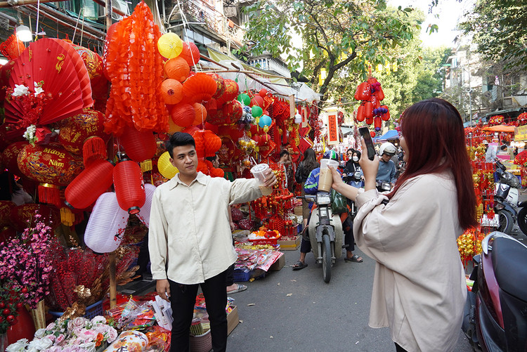 | Du khách nước ngoài cùng hòa vào không khí Tết của người Việt. |