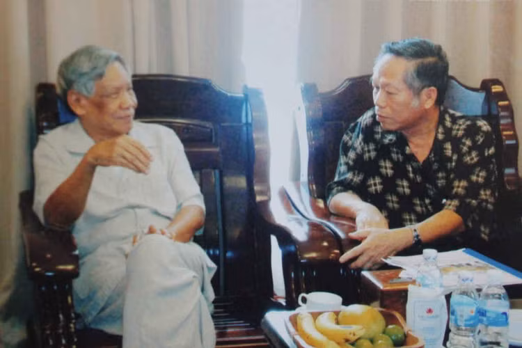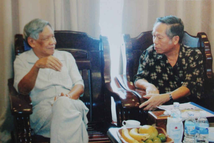 Ông Nguyễn Hữu Bản báo cáo kết quả hội thảo với nguyên Tổng Bí thư Lê Khả Phiêu.