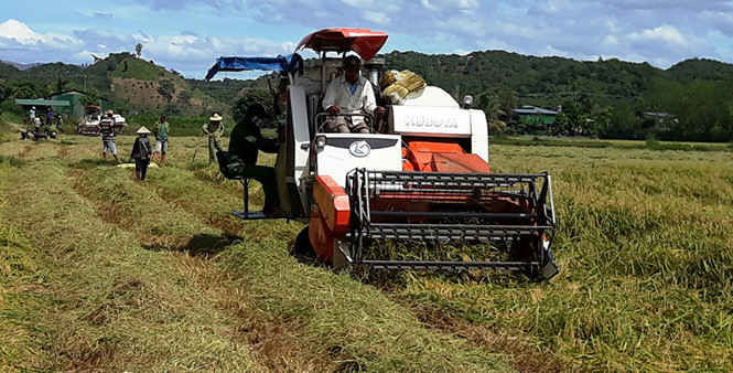 Nông dân Hoàng Anh Tuấn (thôn 4B, xã An Nhơn) vui vẻ: “Làm nếp quýt bây giờ sướng lắm, mình chỉ lo khâu sản xuất là chính, còn thu hoạch đã có máy móc làm.
