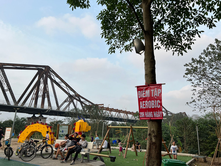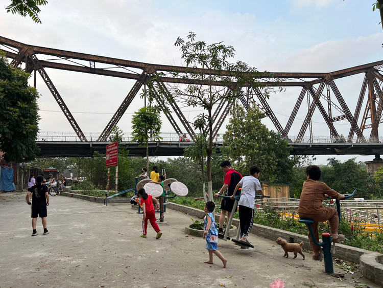 Bãi đất từng đầy cây dại và rác thải dưới chân cầu Long Biên (phường Phúc Tân, quận Hoàn Kiếm, Hà Nội) mới đây đã được cải tạo trở thành sân chơi cho người dân ở nhiều độ tuổi khác nhau.