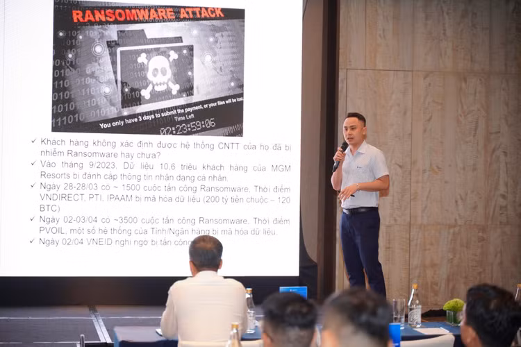 Ông Phạm Trung Đức - Giám đốc Dịch vụ ATTT VNPT trình bày về giải pháp và chiến lược ứng phó, ngăn ngừa nguy cơ an ninh, an toàn thông tin cho doanh nghiệp
