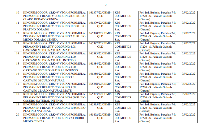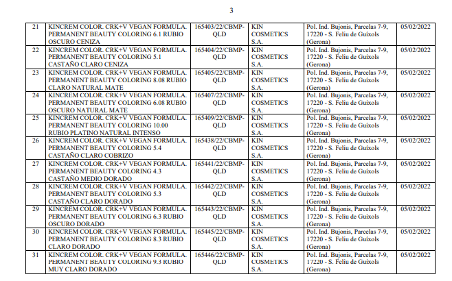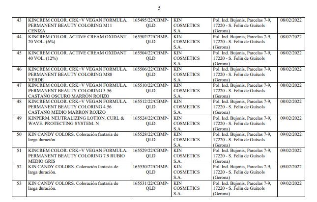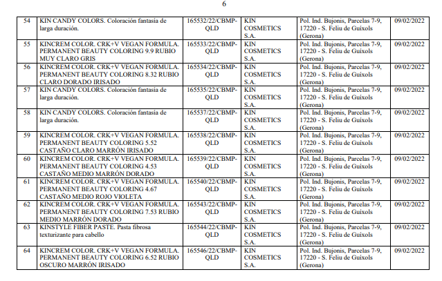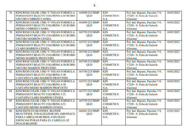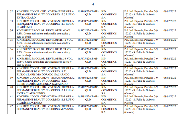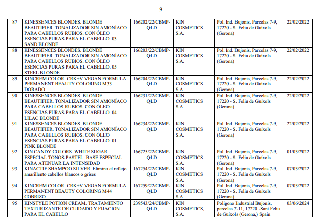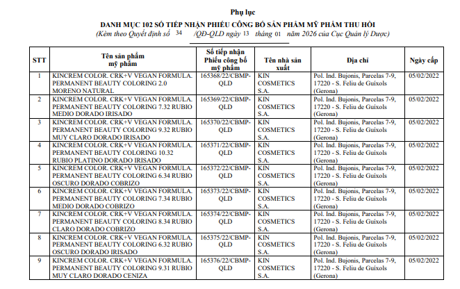 Danh mục kèm theo Quyết định số 34/QĐ-QLD liệt kê chi tiết 102 sản phẩm mỹ phẩm bị thu hồi số tiếp nhận Phiếu công bố. Toàn bộ các sản phẩm này đều do nhà sản xuất KIN COSMETICS S.A. (địa chỉ: Pol. Ind. Bujonis, Parcelas 7-9, 17220 - S. Feliu de Guíxols, Gerona, Tây Ban Nha) sản xuất. Các sản phẩm bị thu hồi chủ yếu thuộc nhóm chăm sóc và làm đẹp tóc.