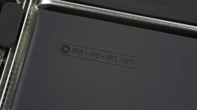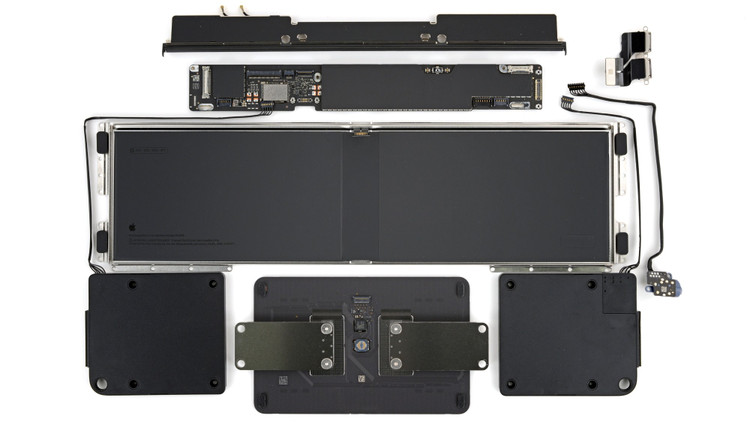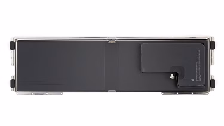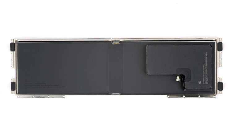 Khay pin có lẽ cũng đóng vai trò tăng thêm độ cứng cho khung máy và có một gờ dập dọc theo toàn bộ chiều dài để giữ cho nó chắc chắn. Điều này, kết hợp với 18 con ốc vít. Một điều bất thường khác là Apple hiện đã liệt kê tất cả các loại ốc vít được sử dụng trong thiết bị: Torx Plus (IP, hay “internal plus”) 8, 5, 3 và 1.