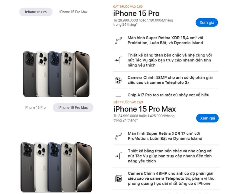 | Giá iPhone 15 Pro và Pro Max. |