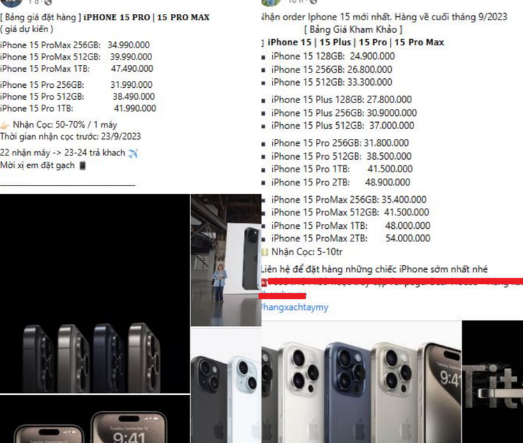 Theo ghi nhận của PV, ở thời điểm hiện tại, iPhone 15 series chưa có sẵn hàng tại thị trường Việt Nam. Tuy nhiên, một số người tiêu dùng muốn sở hữu máy sớm. Chính vì thế, tạo cơ hội cho thị trường “chợ đen” hoạt động sôi nổi. Trên mạng xã hội tại Việt Nam xuất hiện những bài viết về việc đặt cọc iPhone mới, với hình ảnh, cấu hình, giá bán của từng phiên bản, cam kết có máy ngay trong tháng 9 này, nhằm thu hút người dùng đặt cọc. Nhiều nơi đã nhận đặt cọc, với số tiền trả trước từ 3 - 6 triệu đồng. Thậm chí, một số nơi còn yêu cầu khách hàng thanh toán trước 50 đến 100% số tiền.