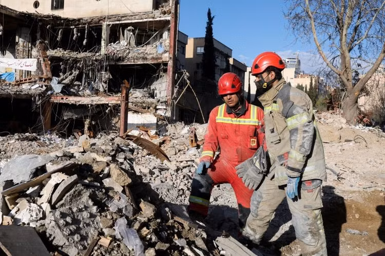 Một đội cứu hộ của Hội Chữ thập đỏ đang làm việc tại một tòa nhà ở Tehran bị hư hại.