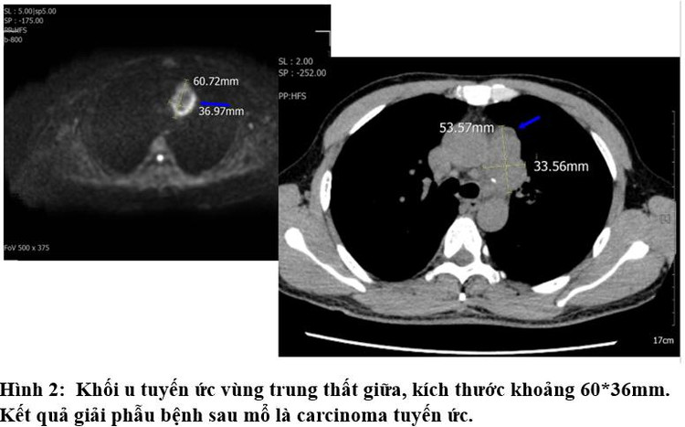 Tại đây, kết quả chụp CT toàn thân của bệnh nhân M. ghi nhận có khối u tuyến ức ở vùng trung thất giữa, với kích thước khoảng 60*36mm. Mẫu giải phẫu bệnh sau phẫu thuật cho thấy khối u tuyến ức ở vùng trung thất giữa của bệnh nhân M. là ung thư tuyến ức (thymic carcinoma). Các bác sĩ đã nhanh chóng hội chẩn để đưa ra các giải pháp điều trị kịp thời cho bệnh nhân M.