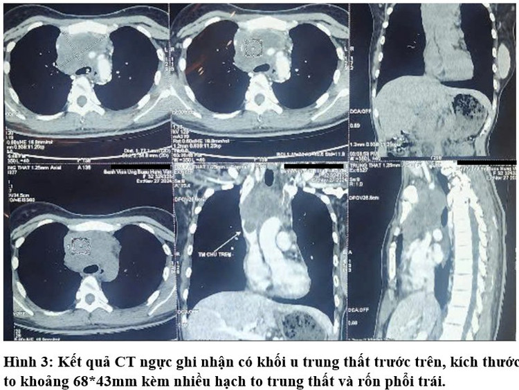 Trường hợp khác, bệnh nhân T. 32 tuổi, (Hà Nội) đi khám vì đau ngực và ho nhiều. Tại đây, bệnh nhân T. được chụp CT ngực. Kết quả ghi nhận bệnh nhân T. có khối u trung thất trước trên với kích thước to khoảng 68*43mm kèm nhiều hạch to trung thất và rốn phổi trái.