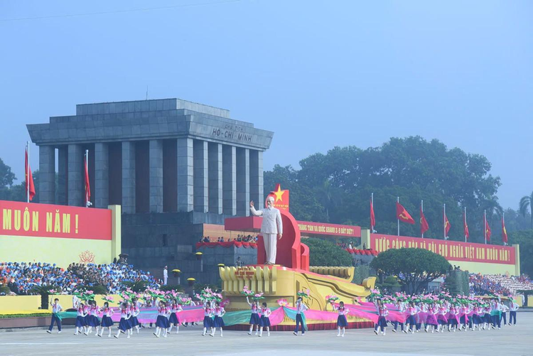 Dưới ánh nắng nhẹ báo hiệu ngày lễ lịch sử đã tới, tiếng nhạc Quốc ca hào hùng vang lên trên Quảng trường Ba Đình lịch sử, hàng nghìn cánh tay giơ cao, ngực áo đỏ sao vàng rực rỡ, cả không gian như lắng đọng trong niềm xúc động thiêng liêng. Khoảnh khắc lá Quốc kỳ tung bay trong gió, theo bước chân mạnh mẽ và dứt khoát của đội quân danh dự, đã trở thành hình ảnh biểu tượng cho sức mạnh, lòng kiên trung và khát vọng hòa bình của dân tộc Việt Nam.