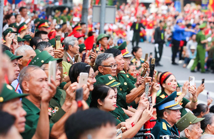 Các cựu chiến binh, người có công với Cách mạng được ưu tiên ngồi tại những vị trí thuận lợi, hào hứng ghi lại khoảnh khắc các đoàn diễu binh đi qua.