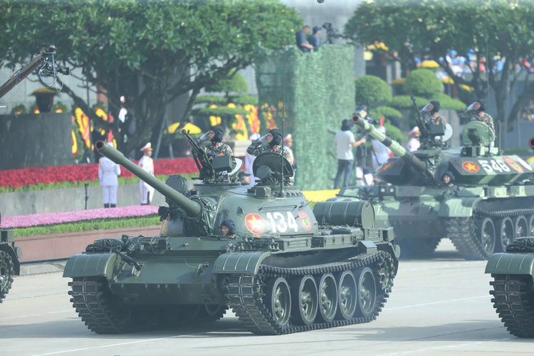 Các khối xe, pháo khí tài quân sự hùng dũng diễu binh cho thấy sức mạnh của quân đội Việt Nam.