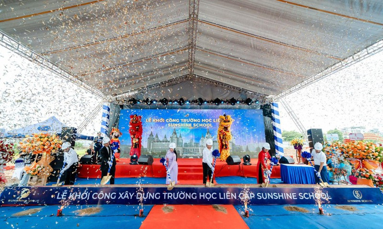 Đại diện Tập đoàn Sunshine, Sunshine School, đơn vị triển khai thi công SCG và đại diện chính quyền địa phương cùng thực hiện nghi thức khởi công trường liên cấp Sunshine School.