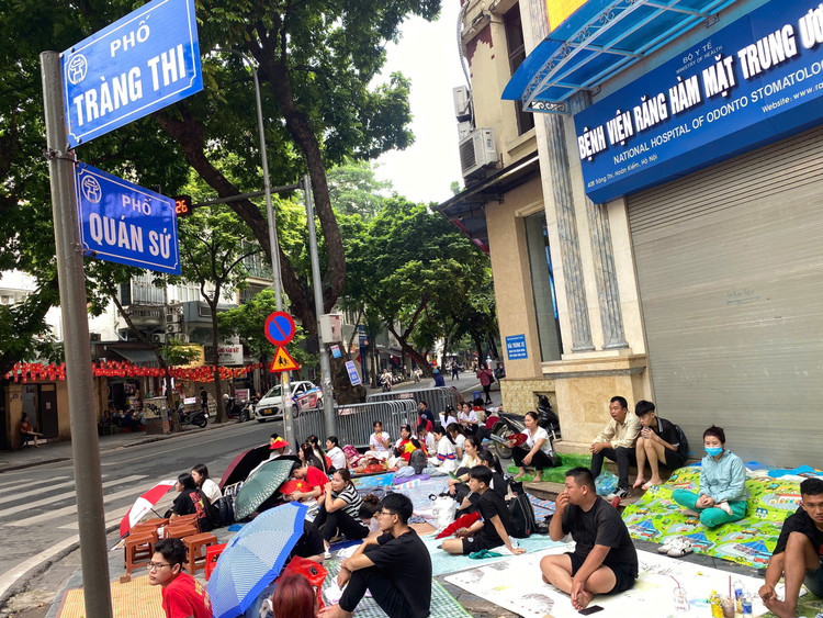 8h50 sáng ngày 1/9, lực lượng chức năng đã có mặt tại khu vực dọc đường Tràng Thi để sắp xếp chỗ ngồi cho người dân, vận động mỗi người ngồi một chỗ, ngăn chặn tình trạng một người giữ chỗ cho nhiều người.