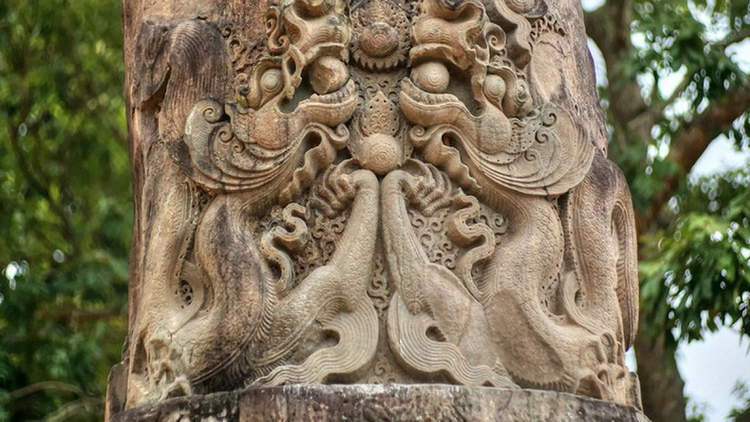 Phần trụ tròn là nơi tập trung tinh hoa mỹ thuật của cột đá, được chạm nổi đôi rồng theo đồ án “lưỡng long hiến châu”. Đây chính là điểm nhấn của phần thân cột đá, và cũng là nét đặc trưng mỹ thuật thời Lý.
