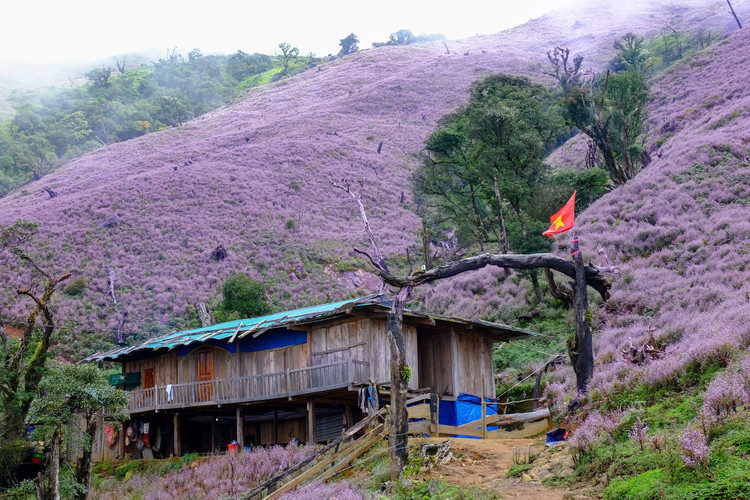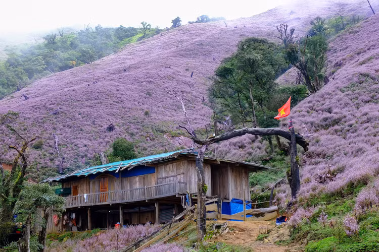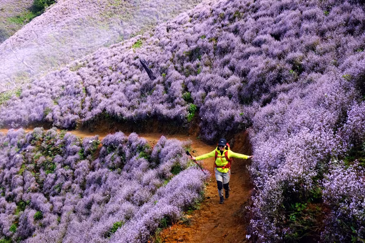 Từ đỉnh xuống lán, porter sẽ dẫn người leo núi đi qua khu vực có loài hoa Chi pâu tím dại hút mắt mọc dày đặc dọc các triền núi thoai thoải.