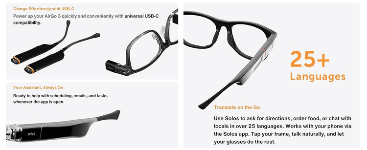 Chiếc kính này được chế tạo bằng cùng một gọng kính với kính AirGo Vision mà Solos ra mắt vào tháng 12 năm ngoái, tích hợp AI đa phương thức và trợ lý giọng nói hỗ trợ ChatGPT.
