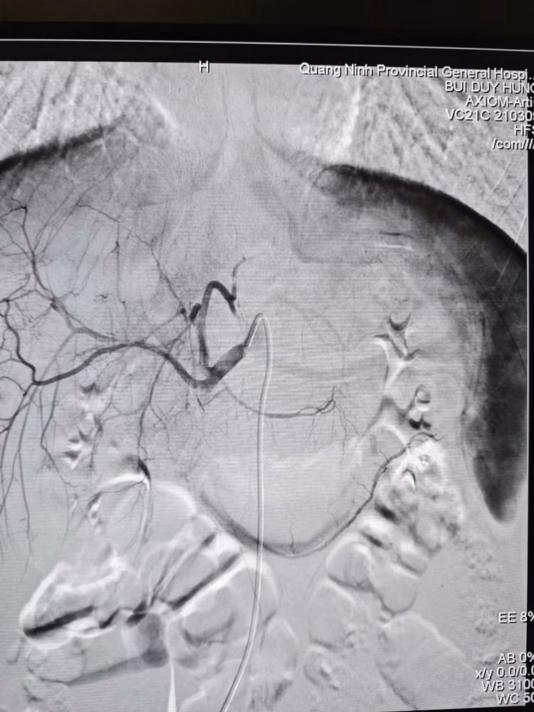 Khi vận chuyển người bệnh về tại cơ sở chính, ê-kíp Can thiệp mạch đã sẵn sàng mọi nguồn lực. Ngay khi tiếp nhận, nhận thấy bệnh nhân có dấu hiệu thiếu máu, các bác sĩ đã chỉ định truyền máu kịp thời trước khi can thiệp. Dưới sự hỗ trợ của hệ thống DSA hiện đại, ê-kíp bác sĩ đã luồn ống thông (Microcatheter) siêu nhỏ 1.9F tiếp cận siêu chọn lọc vị trí nhánh động mạch gan đang chảy máu và nút tắc bằng vật liệu chuyên dụng Spongel.