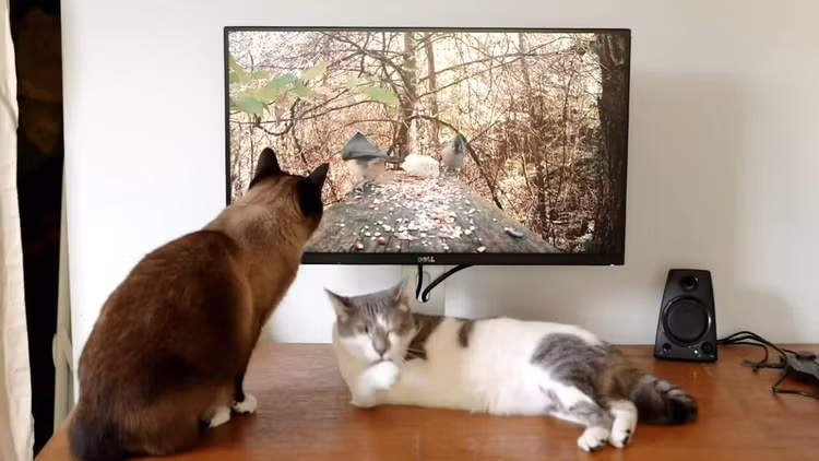 Còn đối với mèo, chúng là thợ săn bẩm sinh, nên thường có phản ứng mạnh với hình ảnh của loài gặm nhấm và chim trên TV. Một nghiên cứu với hơn 100 con mèo cho thấy thời gian trung bình mà chúng dành để xem TV là hơn 6%, và các chương trình về động vật là phổ biến nhất.