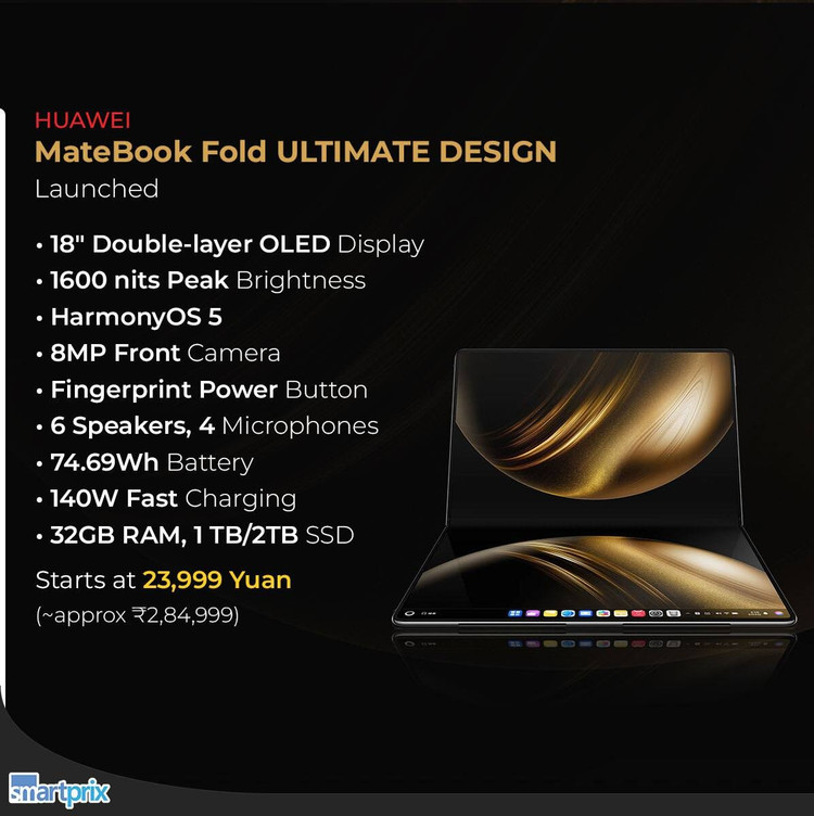 HUAWEI MateBook Fold Ultimate có ba màu sắc với kết cấu khác nhau. Đáng chú ý, bàn phím không dây của sản phẩm này cũng có các tùy chọn màu sắc tương ứng với máy. Ở bên trong, máy được trang bị pin 74,69Wh, hai cổng USB-C, 6 loa và 4 micrô. Kết nối không dây bao gồm Wi-Fi 6 băng tần kép và Bluetooth 5.2. Sản phẩm được bán kèm bàn phím, túi đựng, bộ sạc và cáp USB-C 140W.