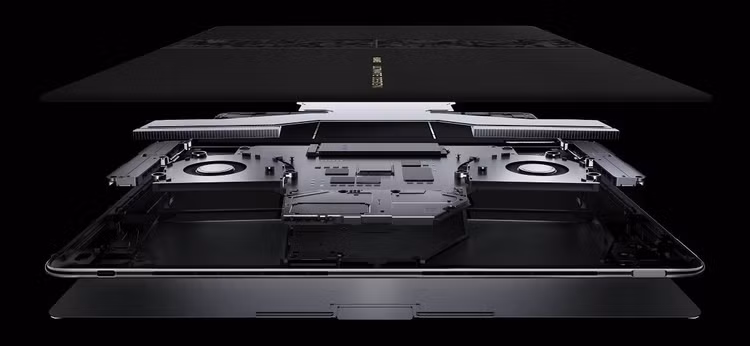 Với trọng lượng chỉ 1,16 kg và độ mỏng ấn tượng 14,9mm khi đóng lại (7,3mm khi mở), HUAWEI MateBook Fold Ultimate thể hiện sự kết hợp hoàn hảo giữa công nghệ và thiết kế. Theo GSMArena, Huawei đã sử dụng PCB siêu mỏng và cấu trúc nhôm ba lớp để đảm bảo độ cứng cáp và mỏng nhẹ cho thiết bị. Hệ thống tản nhiệt gồm buồng hơi và hai quạt siêu mỏng giúp làm mát chipset. Thông số cấu hình chi tiết về chipset vẫn chưa được công bố, tuy nhiên, máy sẽ được trang bị RAM 32GB và tùy chọn SSD 1TB hoặc 2TB.