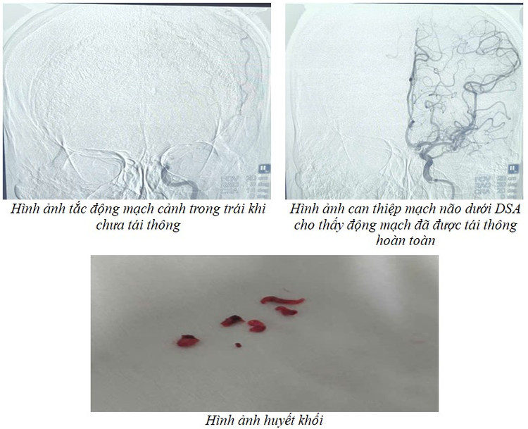 Cùng với những nỗ lực và quyết tâm của các bác sĩ, kỹ thuật viên, sau khoảng 20 phút can thiệp, Ê kíp đã lấy ra 6 mảnh huyết khối, người bệnh đã được tái thông hoàn toàn động mạch bị tắc. Sau can thiệp, người bệnh cải thiện ý thức tốt hơn, hết kích thích, gọi hỏi đã trả lời đúng.