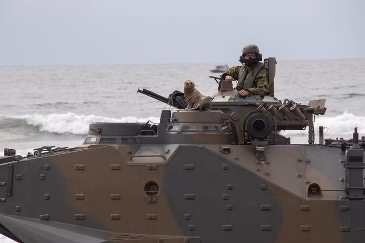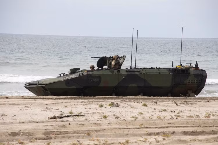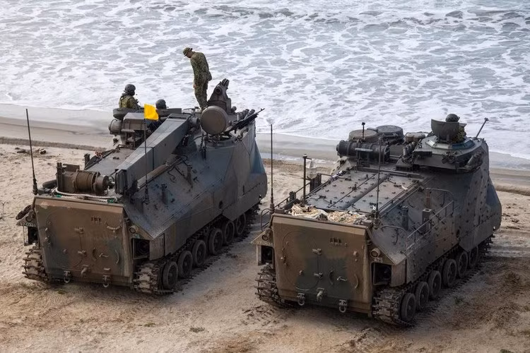 Các phương tiện đổ bộ tấn công của Lực lượng Phòng vệ Mặt đất Nhật Bản (JGSDF) thuộc Trung đoàn Triển khai Nhanh Đổ bộ số 2 chuẩn bị cho cuộc diễn tập đổ bộ đường thủy trong chương trình huấn luyện tấn công đổ bộ song phương trong khuôn khổ cuộc diễn tập Iron Fist 2022 tại White Beach, Căn cứ Lính thủy Đánh bộ Pendleton, California, ngày 1/2/2022