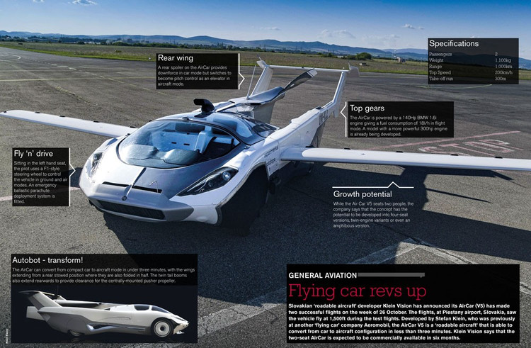 AirCar với hai chỗ ngồi có thể triển khai cánh chỉ trong chưa đầy hai phút để chuẩn bị cất cánh, rồi gấp gọn lại khi hạ cánh đến nơi. Ông Stefan Klein, người sáng lập Klein Vision, nói rằng AirCar đã “hiện thực hóa giấc mơ cả đời” của ông trong việc đưa hàng không cá nhân đến tay người dân thường".