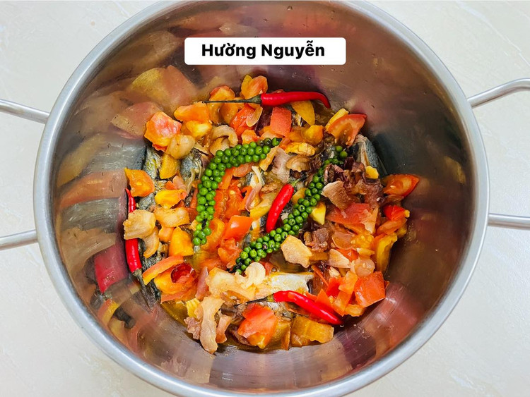 - Cho cá vào chảo cùng với cà chua xào. Thêm 2 thìa canh nước mắm, 1 thìa canh đường, 1 thìa bột canh, 1/2 thìa canh hạt tiêu, tiêu xanh.