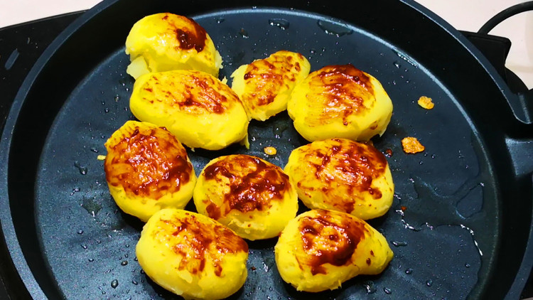 - Lấy một chiếc chảo nướng điện, làm nóng chảo trên và dưới, quét một lớp dầu ăn vào đĩa đáy, sau đó cho khoai tây đã gọt vỏ vào, sau đó quét đều một lớp dầu ăn lên bề mặt của từng củ khoai tây, sau đó đậy nắp lại và nướng trong khoảng 2 đến 3 phút, khi bề mặt khoai tây chuyển sang màu vàng nâu.