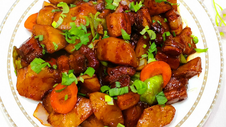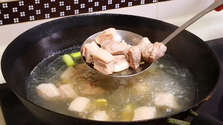 - Sau đó chuẩn bị một miếng thịt ba chỉ, rửa sạch, chặt miếng nhỏ, cho vào nồi nước lạnh, thêm một lượng hành lá, gừng thái lát và rượu nấu ăn vừa đủ, chần qua một lúc để làm sạch máu trong thịt, sau đó đổ nước và vớt ra để sử dụng sau.