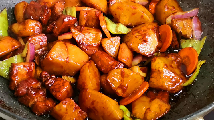 - Sau khi hầm khoảng 15 phút, đổ khoai tây vào và tiếp tục hầm ở lửa vừa trong 5 phút. Sau đó thêm hành tây, cà rốt thái lát và ớt chuông xanh. Đun nóng lửa lớn cho đến khi nước sốt cạn bớt.
