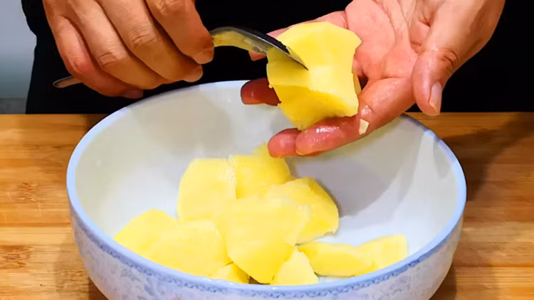 - Chuẩn bị một ít khoai tây tươi, gọt vỏ, rửa sạch, sau đó dùng thìa hoặc dao cắt thành từng miếng nhỏ có kích thước bằng nhau. Ngâm những miếng khoai tây vào nước sạch để sử dụng sau này để tránh khoai bị oxy hóa và chuyển sang màu đen.