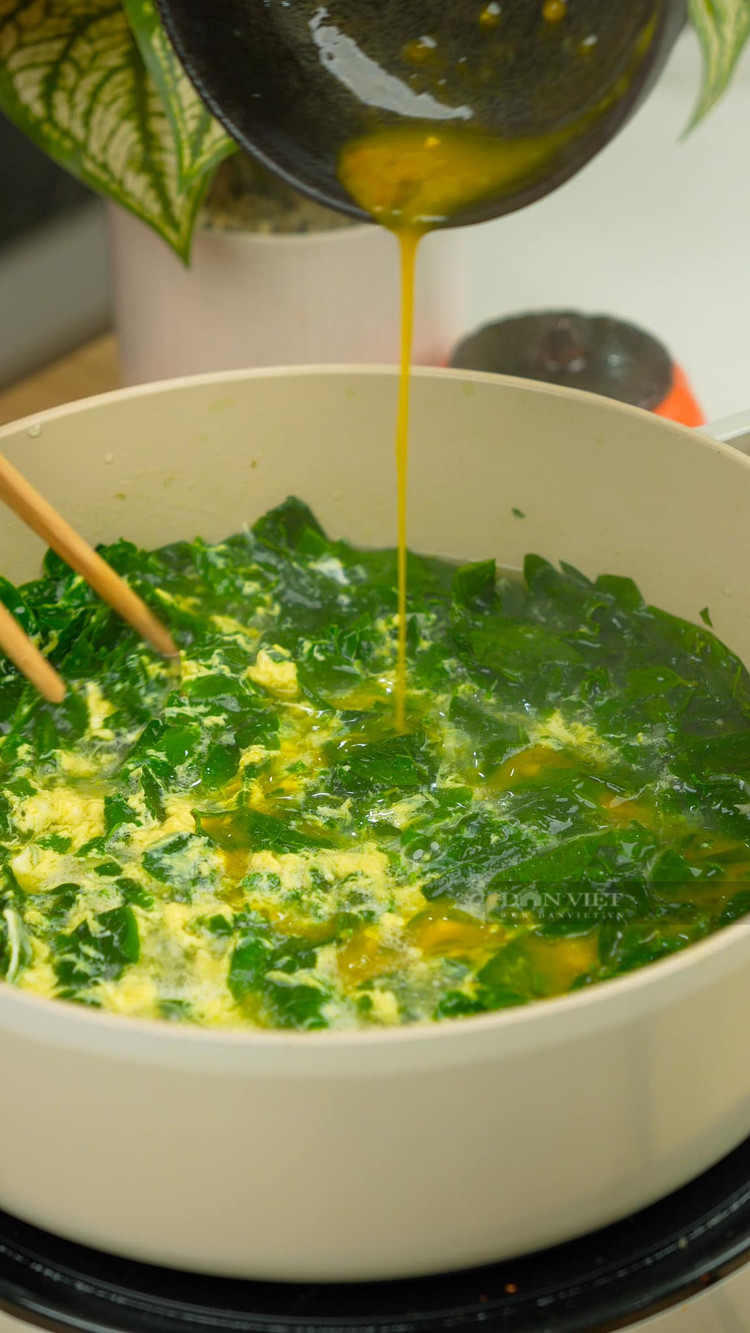 - Nước sôi cho trứng vào quấy đều, đợi sôi trở lại tắt bếp cho ra bát tô và thưởng thức.