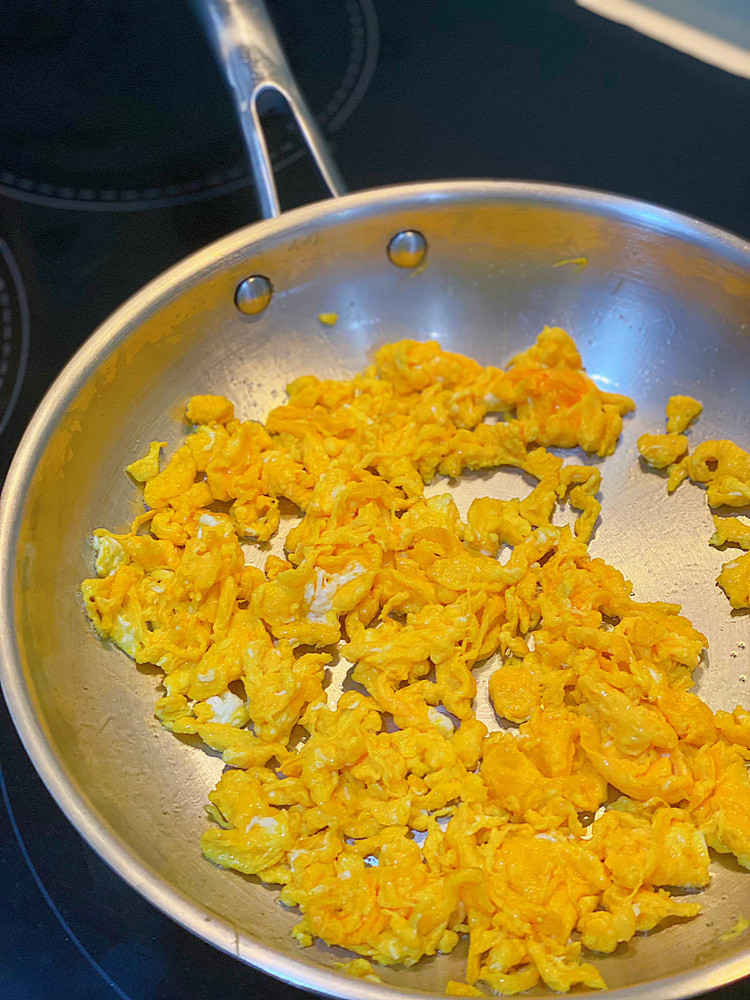 - 4 quả trứng gà ta thêm 1 thìa cafe mắm đánh tan, cho vào chảo nóng dầu già, đảo nhanh tay để trứng tạo sợi đẹp, cho trứng ra đĩa.