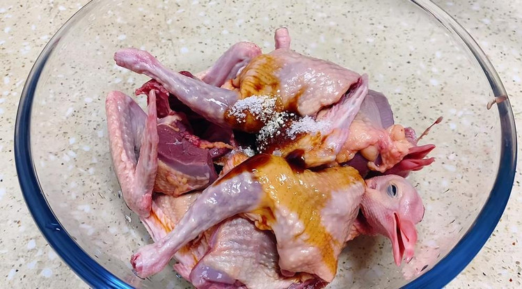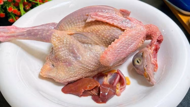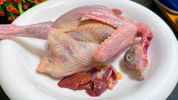 - Cắt bỏ phần đầu và cổ chim bồ câu bỏ đi. Cắt phần còn lại thành từng miếng nhỏ.