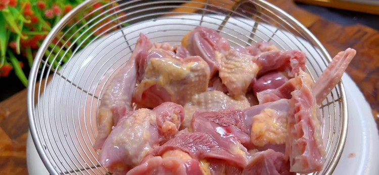 - Thịt chim bồ câu đã cắt nhỏ ngâm trong nước khoảng 10 phút, sau đó rửa sạch nhiều lần dưới vòi nước chảy cho hết máu, rồi vớt ra, để ráo nước.