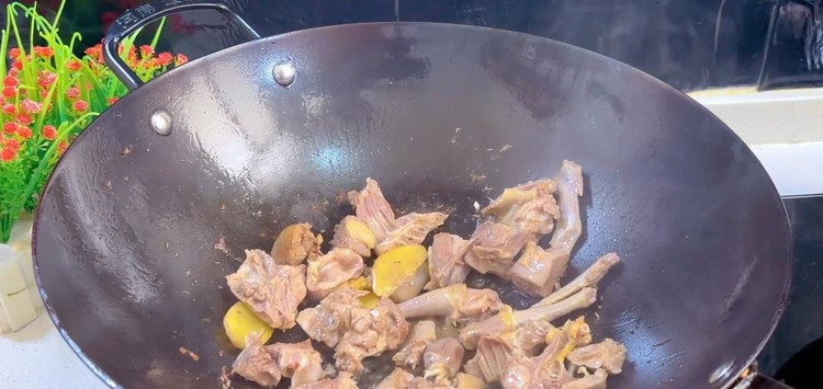 - Đun nóng dầu trong chảo, cho thịt bồ câu vào xào thơm vài lát gừng để khử mùi tanh và thêm mùi thơm. Xào trên lửa lớn cho đến khi có mùi thơm và đổi màu.