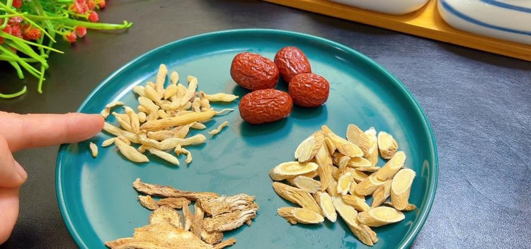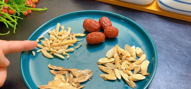 - Chuẩn bị 10 gam hoàng kỳ, 5 gam rễ cây bạch chỉ, 4 quả chà là đỏ và 10 gam mạch môn, ngâm trong nước, rửa sạch và để riêng.