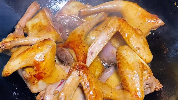 - Đổ thêm chút dầu ăn vào nồi, cho từng miếng thịt bồ câu vào, chiên thịt bồ câu trên lửa vừa đến khi vàng đều hai mặt thì tắt bếp, để riêng.