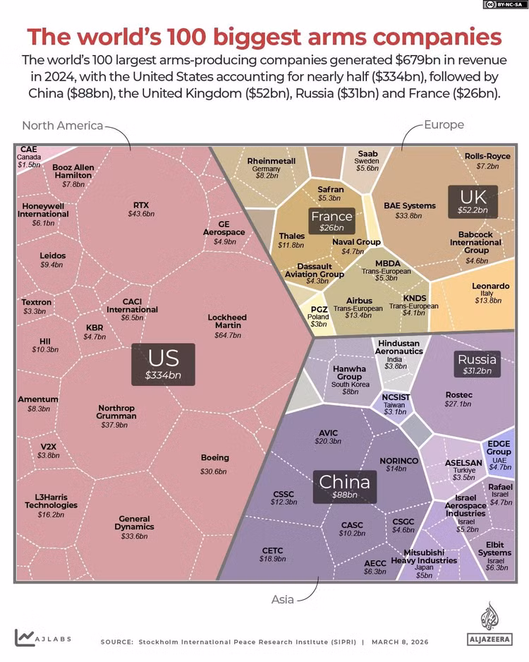 Doanh thu quốc phòng của các nước hàng đầu trên thế giới,Các công ty Mỹ chiếm ưu thế với gần một nửa doanh thu (334 tỷ đô la), tiếp theo là Trung Quốc (88 tỷ đô la), Vương quốc Anh (52 tỷ đô la), Nga (31 tỷ đô la) và Pháp (26 tỷ đô la).