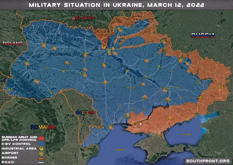 Ngày 12/3, lực lượng quân đội Nga, dân quân Lugansk (LPR) và Donetsk (DPR) phát triển chậm trên miền Đông Ukraine, các đơn vị DPR tiếp tục tấn công trên vùng Donbass, quân đội Nga tiến vào vùng Zaporizhia.