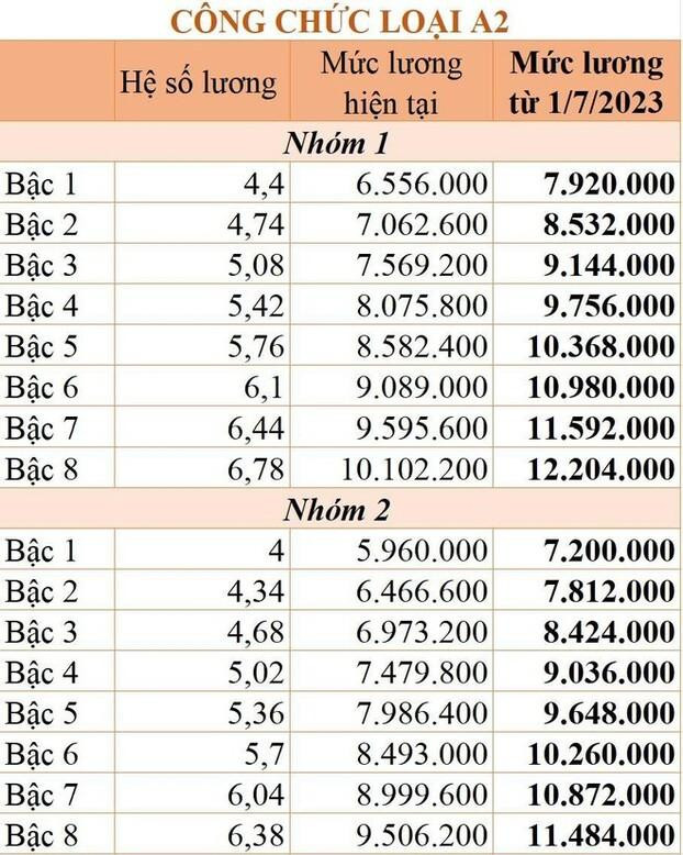 Trong đó, hệ số vẫn được quy định cố định trong các phụ lục ban hành kèm theo Nghị định 204/2004/NĐ-CP do chưa thực hiện cải cách tiền lương. Cụ thể, bảng lương công chức từ ngày 01/7/2023 như sau: