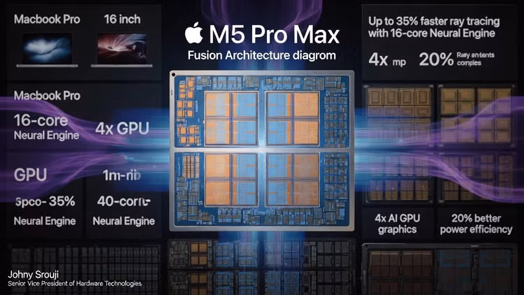 M5 Pro và M5 Max được xây dựng trên kiến trúc Fusion Architecture mới do Apple thiết kế, kết hợp hai die trong một hệ thống trên chip. Cả hai đều sở hữu CPU tối đa 18 lõi gồm 6 lõi hiệu năng cao và 12 lõi hiệu suất, mang lại hiệu năng nhanh hơn tới 30% so với thế hệ trước. GPU thế hệ mới tích hợp Neural Accelerator trong từng lõi, giúp tăng tốc xử lý AI và đồ họa.