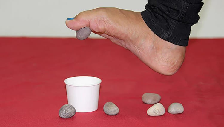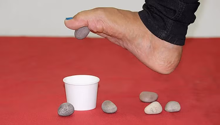Trong khi ngồi, dùng ngón chân để nhặt từng viên bi và đặt chúng vào bát.