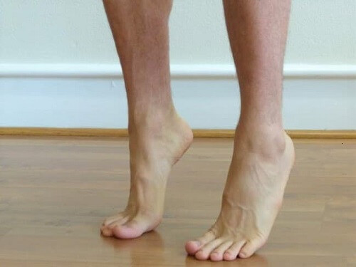 Trong khi đứng, nâng gót chân lên cao nhất có thể, dồn toàn bộ trọng lượng cơ thể lên phần trước bàn chân. Có thể tựa vào ghế hoặc tường để hỗ trợ cân bằng.